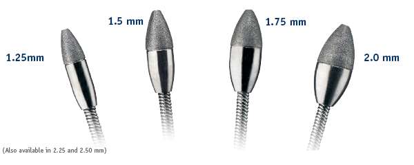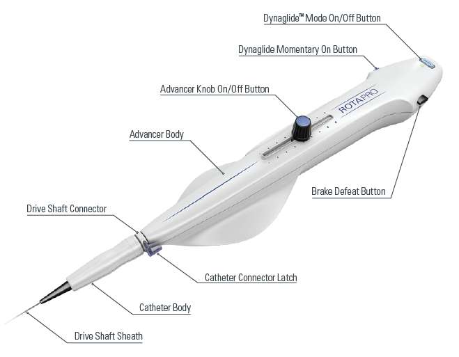 - Utilizes a high speed (160,000+ RPM) rotating diamond coated burr to ablate atherosclerotic plaque and restore luminal patency.