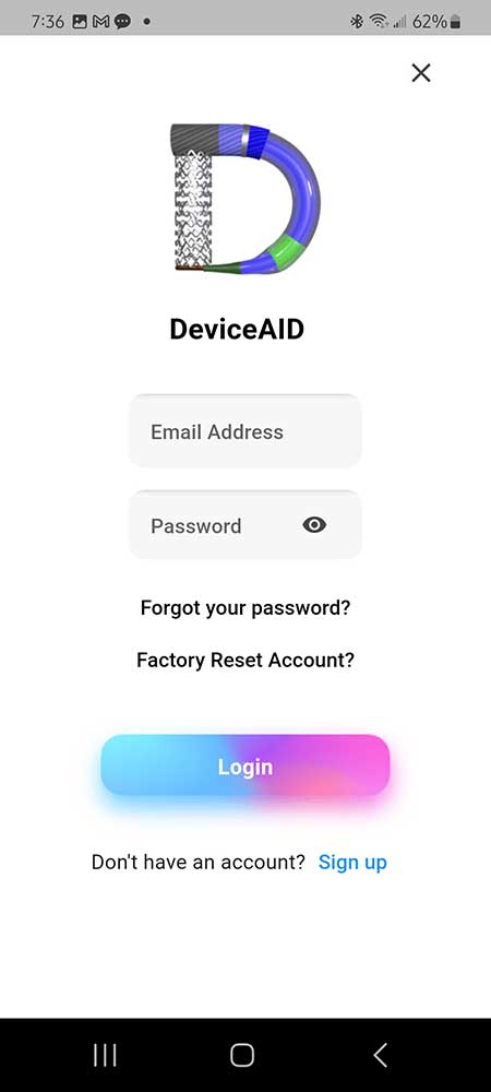 - Open the DeviceAID application on your device. Please note that you must be logged into your account in order to delete it. If you are already logged into your account, skip to step #3.