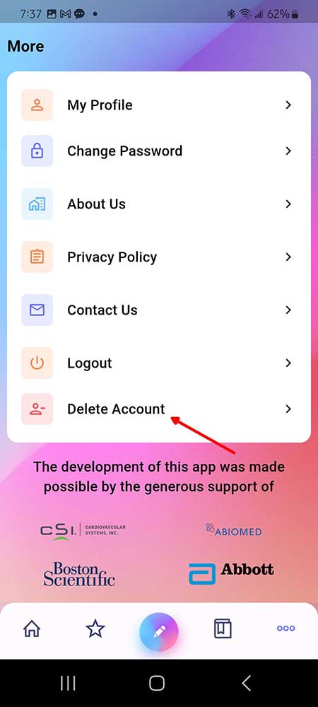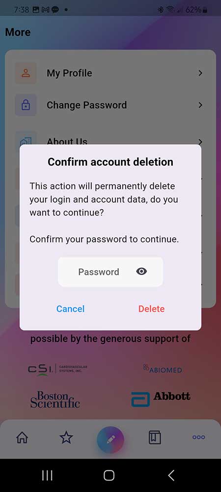 - To delete your account, from the Home screen, click the “…” button at the bottom right corner bringing you to the “More” screen and select the last item: Delete Account. You must enter your password to confirm you wish to permanently delete your account. We will not be able to recover your saved Favorite Devices or Quiz scores after you finalize your action by clicking the red “Delete” button.