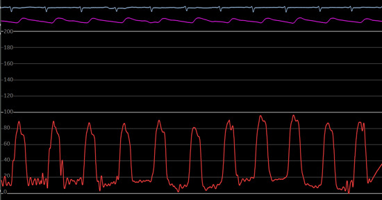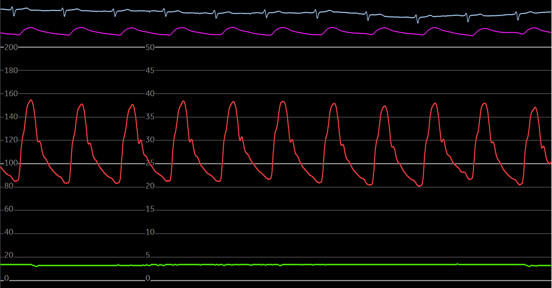 Figure 3: LV pressure waveform. Notice the rapid systolic upstroke, wide pulse pressure and the dicrotic notch.