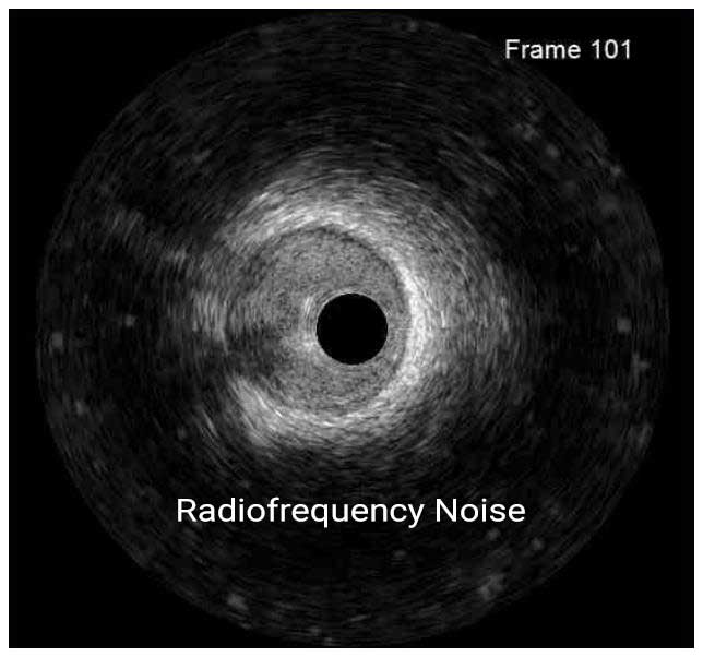 In a normal coronary artery, an ultrasound reflection is generated at two tissue interfaces: at the border between blood and the leading edge of intima and at the external elastic membrane (EEM) located at the media-adventitia border. The resulting three-layered structure consists of the tunica intima (bright, relatively echogenic layer compared to lumen and media), media (dark, less echogenic layer compared to intima) and adventitia (bright). Tunica media has lower ultrasound reflectance due to lower content of collagen and elastin (highly reflective materials) compared to intima and adventitia. The trailing edge of the intima, internal elastic membrane (IEM), cannot always be distinguished clearly on IVUS images. Similarly, IVUS cannot detect the outer border of adventitia due to comparable echoreflectivity of adventitia and periadventitial tissue.1,2
