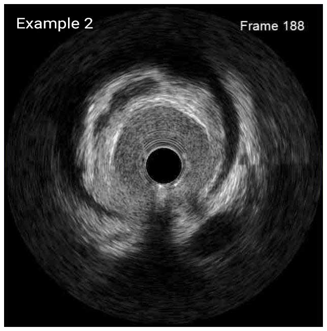 The epicardium appears as a bright layer outside the vessel on IVUS. By identifying the epicardium, the direction of branching of major branching vessels can be inferred. For example, in the LAD, the diagonal branch appears at about 90 degrees counterclockwise of the epicardium. The septal branch appears to be at about 90 degrees clockwise of the epicardium.